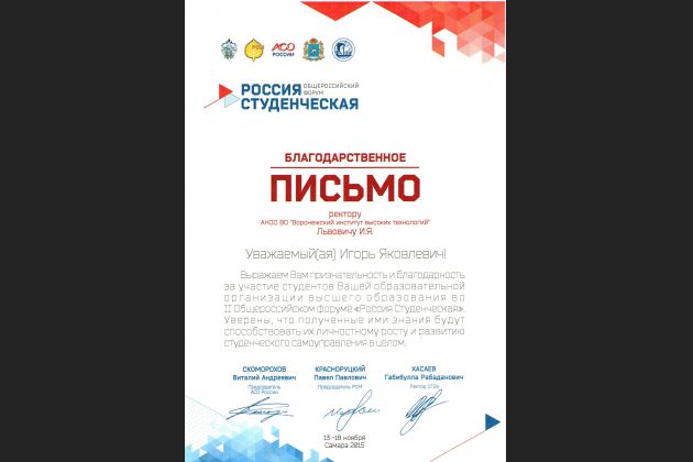 В работе Форума приняли участие более тысячи студентов из 50 субъектов РФ, в том числе и студенты Воронежского института высоких технологий Солодкий Максим и Семенов Антон.